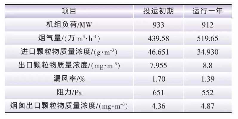 河南平頂山發電分公司2×1 000 MW機組超低排放改造工程,是國內首臺1 000 MW等級超凈電袋項目,于2015年改造完成并投運。其燃用煤種為山西長治貧煤,其灰分高達39.78%,飛灰中SiO2和Al2O3含量高,比電阻較大,是典型的劣質煤。該工程原采用3室5電場靜電除塵器,并經過低低溫電除塵提效改造,但未能達標排放,好終采用超凈電袋技術方案再次提效改造[19]。2號爐超凈電袋投運初期和運行一年的性能測試結果見表2。測試表明,投運初期和運行一年后的各項性能都非常穩定地滿足設計要求,除塵器出口及煙囪出口顆粒物排放均達到超低排放要求。