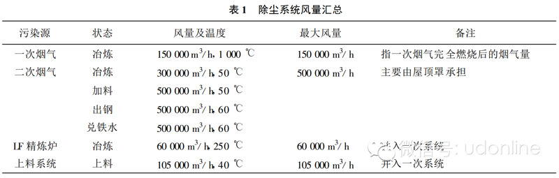 5)   除塵系統風量匯總:除塵系統風量匯總見表1。